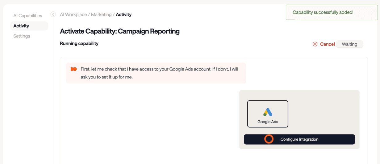 Instead of building logic, you respond to a few prompts. For example, selecting a campaign, defining the output, or connecting a data source.